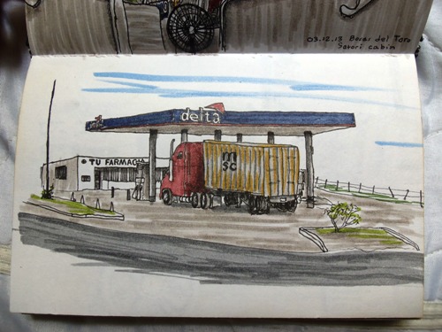 A drawing of a gas station hitchhiking on the Panamerican highway from Bocas del Toro to Panama City.
