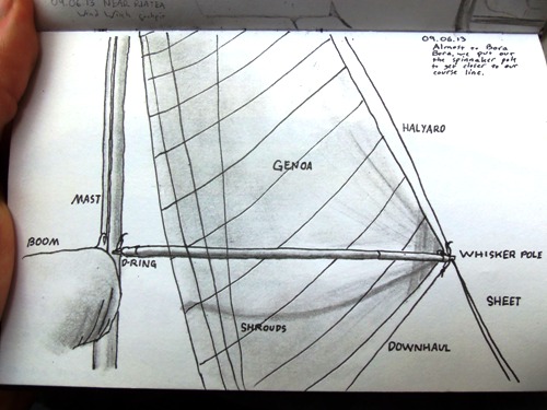We employed the whisker pole often in order to sail more into the wind. Here’s a diagram of the whisker pole and genoa.