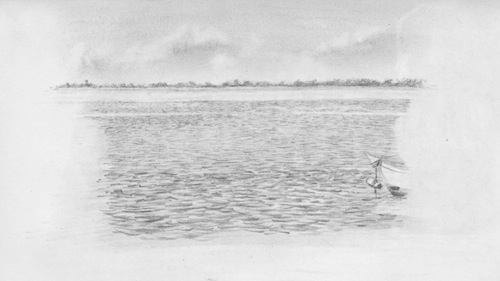 The beach where I set up the tent was nearly secluded. The next day I burnt myself building an involved castle in the sand. It was a damn fine castle, if I do say so myself, and I do. I began with a large log that I’d placed into the lightly lapping water connected to a thick jumble of skinny stalks growing at the waterline. The log blocked the waves. Then I began breaking off sticks and jamming them deep into the sand behind the log, creating a seawall. I filled the space behind it with sand, and then, to fill the gaps, I packed in twigs, leaves and more sand.