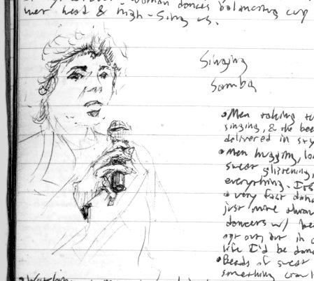 My companions, who were Brazilian girls, let the tunes penetrate their skin, which would pester each molecule into movement until they were quite sweaty on the floor. I sat back and drew the woman singer, and watched the dancers. One petite woman with glasses and slicked back hair moved and balanced a cup of beer on her head to the music, giving high fives to everyone she crossed. A man in a loose chemise and cowboy hat seemed to dance with all the pretty girls, and would yank them close to him in the quickness of Samba.