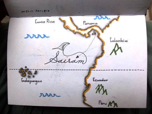 The boat’s popularity is undeniable. Sairam is a Polynesian-style catamaran–that is, a catamaran whose two hulls are connected by stalwart wooden beams. When I first saw the boat pull into Playita anchorage, I had been on Dirk’s boat, and we made a few sly comments. Now I recant. Dirk has also come around to appreciate the uniqueness of Sairam. Guido says that on arrival in French Polynesia, and from then on through the Polynesian islands, he expects the inhabitants to be ecstatic to see such a large version of their traditional rowing vessels. Even now, sailors and cruisers are seemingly mystified by the construction of Sairam, and refer to it as the Water World boat. The only true difference is that Guido, unlike Kevin Costner, does not swing like a marine Tarzan from one hull to the other.