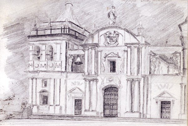 Leon, Nicaragua is a tall one-story city. The roofs of the high buildings stretch out over the sidewalk so that when it rains the water is escorted directly to the street instead of on the heads of the walkers down below. The blocks are whole solid entities, and their walls climb 20 feet into the air to meet the roof’s rain-catching precipice. They make the strolling pedestrians look small and slow.