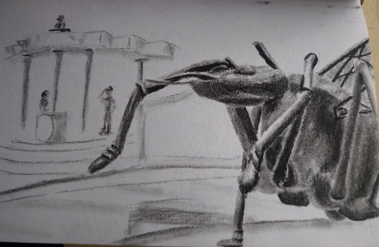 I took the dirt road, the paved road leading to the entrance. I walked by shaded properties with all sorts of animals. I inquired at a house about the way into the pyramids. I sugarcoated my question so as not to cause concern for wanting to sneak in. “Could you tell me where I could get a high view of pyramids so that I could draw them?”