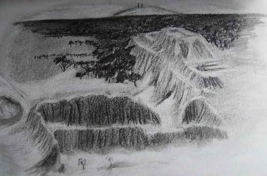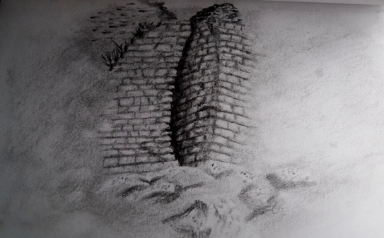 Kuelap is a ruin near Chachapoyas, in Peru. It is larger than Machu Picchu but not as stunning. This is a travel drawing of Kuelap’s narrow entrance..