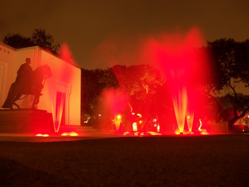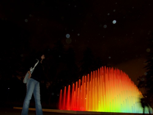 Walking the streets at night I grip her hand unwavering. A bus and a jaunt and we’re at the gates of the park. Inside we find beautiful displays of watery propulsion systems. The sky is a dark pallid orange, the effect of lights polluting the night of the second largest desert city in the world.