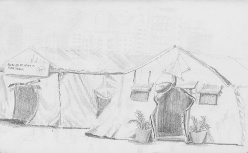 Another day I walked into the center, and then circled around those apocalyptic buildings to come upon a sight that would repeat itself in other parts of the city. They were military tents. The tents had been set up as free services to the people. I decided I liked the idea, it made sense. Military doctors are probably bored much of the time during peace. Taxes pay their salary, so why shouldn’t they be put to work for the people? Then again, a serious drawback of this kind of socialism, which ignores all concern for aesthetic, is that it renders the public sphere bland, or in this case, populated by the military. The pure capitalist and consumerist society is instead flooded by a dizzying tsunami of advertisements, also unpleasant to the eye. Whether it’s seeing the military all over the place with Chavez’ face and nationalistic slogans, or seeing branding hijack human values everywhere you look, the truth in both cases is that the regular person is left without much choice of impartiality. Our surroundings are going to influence us whether we like it or not.