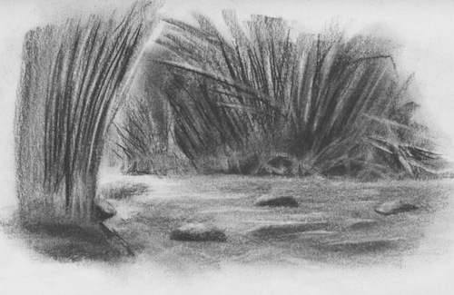 “I’m hungry again. I have some Dorado that I gave to the head lady at the campsite where I am. I bet she’ll cook those up.” Nelson shouldered his canvas bag, and tucked the overflowing pad of paper under his arm. He showed me his drawings–of Dali, of Warhol, of Chavez. They were so heavily contrasted in thick dark charcoal and a wetting technique against white pulp, that they seemed to enter a third dimension. They bounced under his arm.